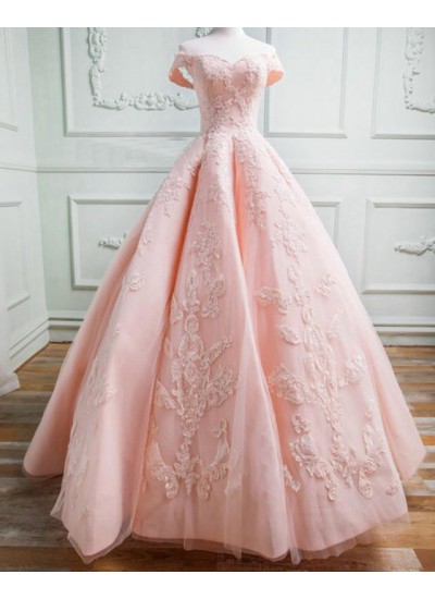 Pink party dress off shoulder evening dress lace applique ball gown prom dress