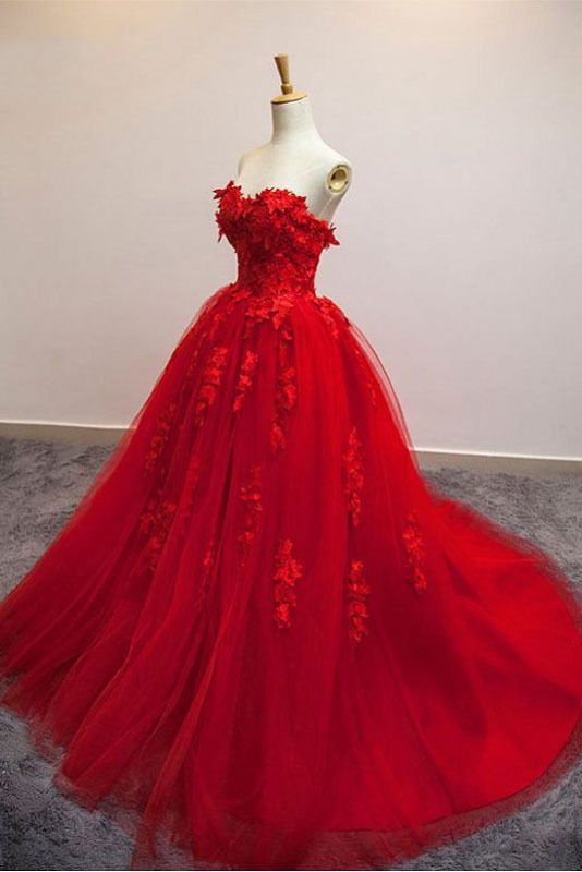 Red party dress, strapless evening dress, lace applique prom dress, tulle ball gown dress