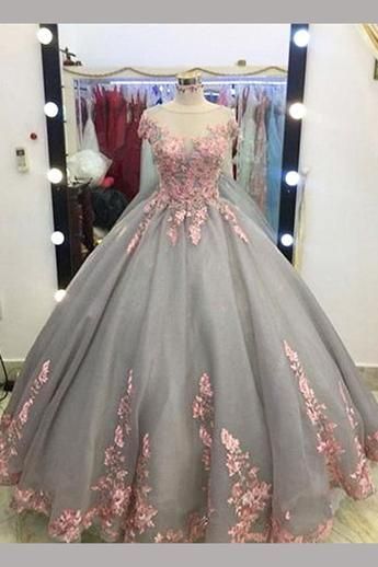 Gray Ball Gown Cap Sleeves Floor-length Pink Lace Appliques Prom Dress,Quinceanera Dresses,Custom made