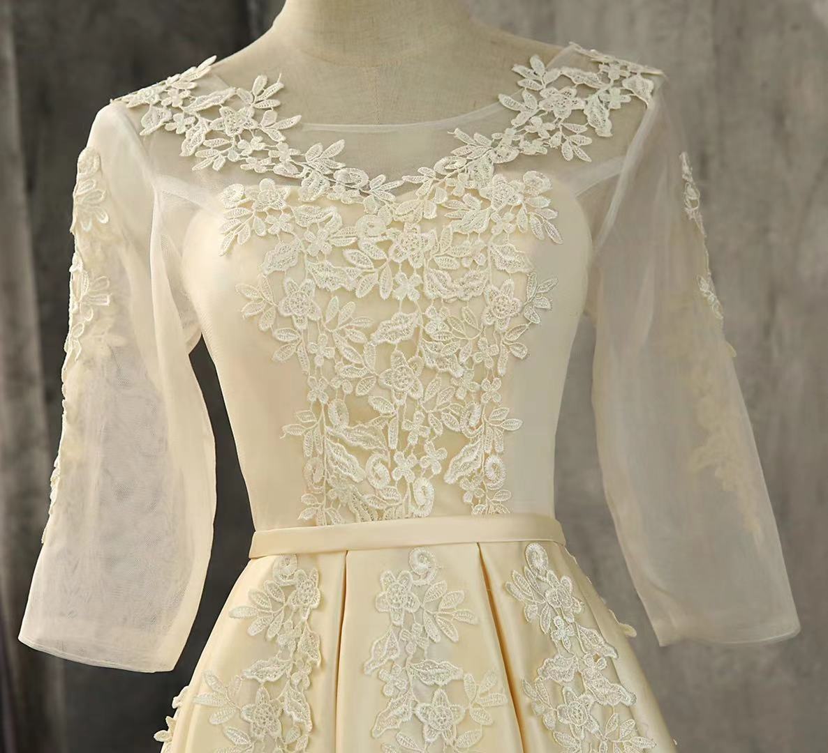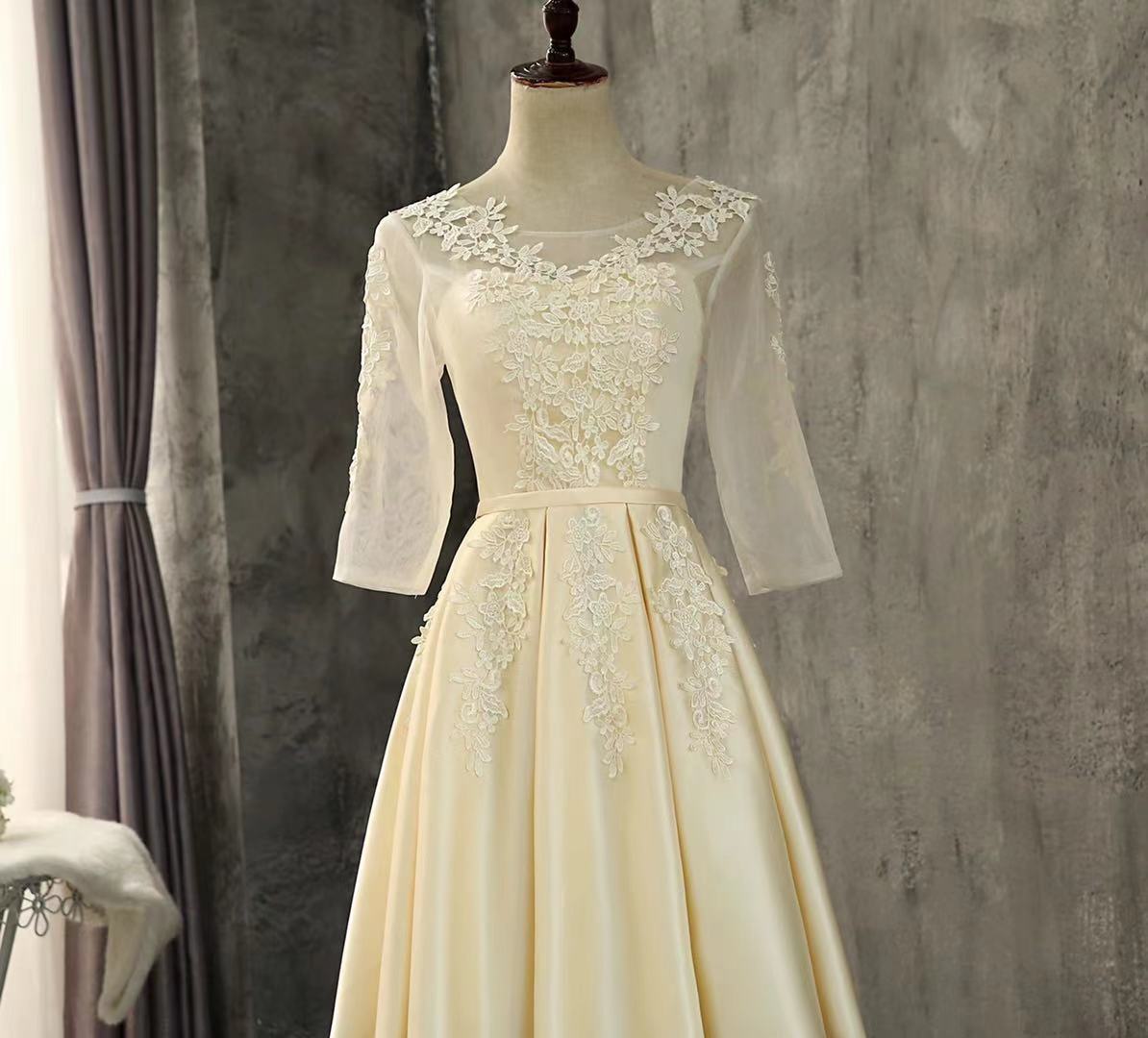 Cream yellow party dress long sleeves evening dress lace applique prom dress satin formal dress