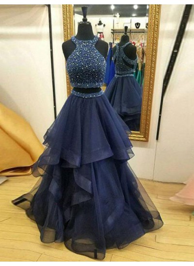 Navy Blue party dress halter neck evening dress two piece prom dress tulle beading formal dress