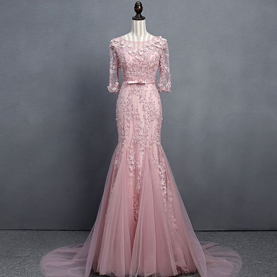 Pink party dress long sleeve evening dress lace applique prom dress tulle mermaid formal dress