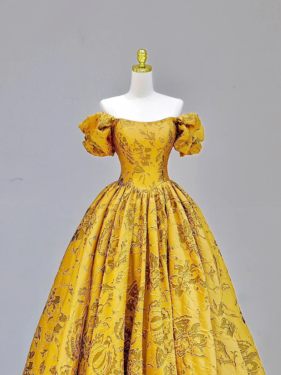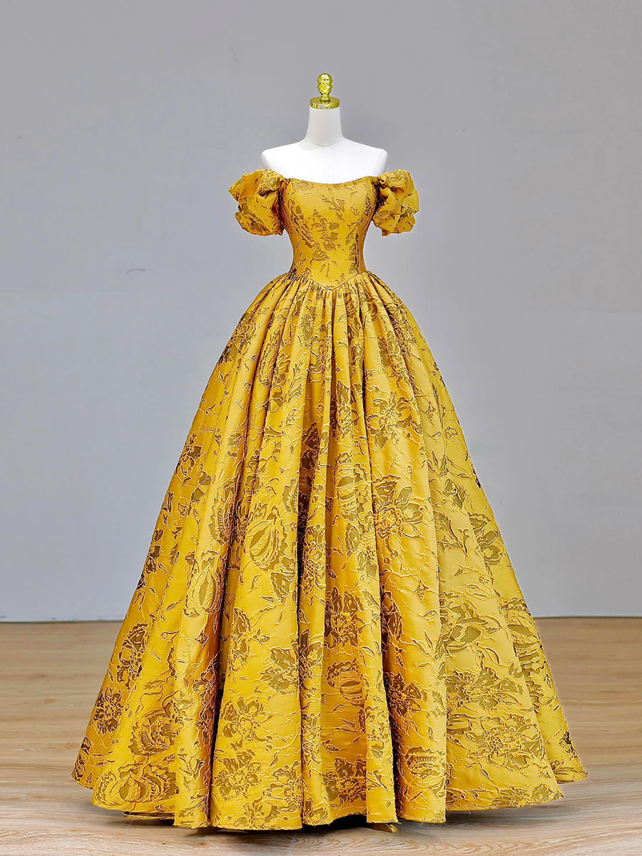 Yellow Printed Pattern Floor Length Prom Dress Elegant Off The Shoulder Formal Dress