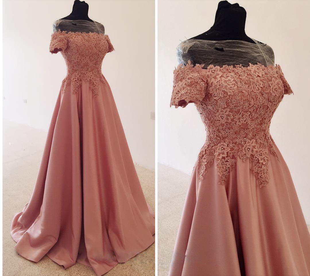 Off-the-Shoulder evening dress Satin Prom Dress, Beaded Lace Long Prom Dress, Gentle A-Line Evening Dress
