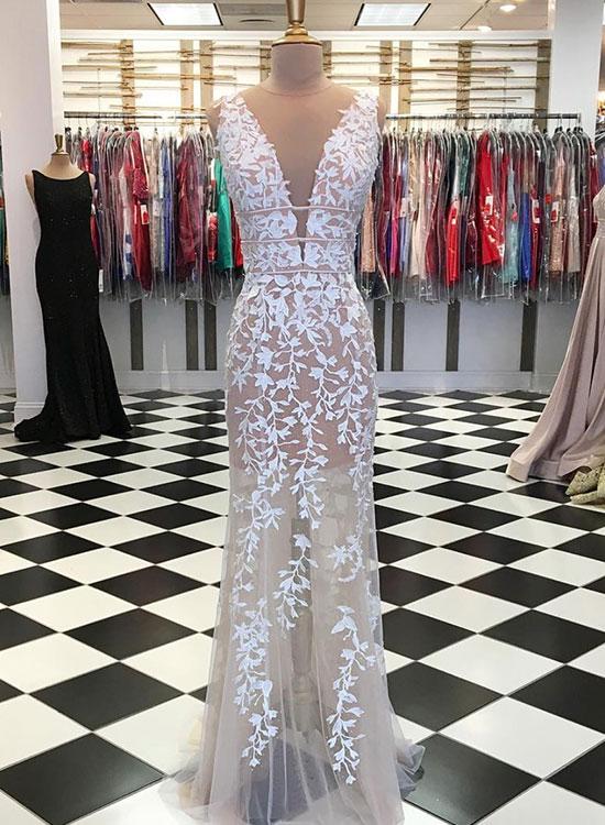 Champagne party dress v neck evening dress lace applique long prom dress