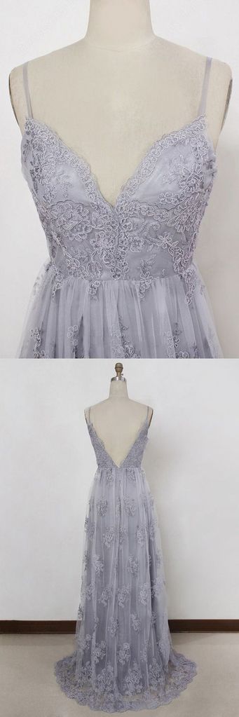 Grey spaghetti straps prom dress applique backless evening dress a-line tulle wedding dress