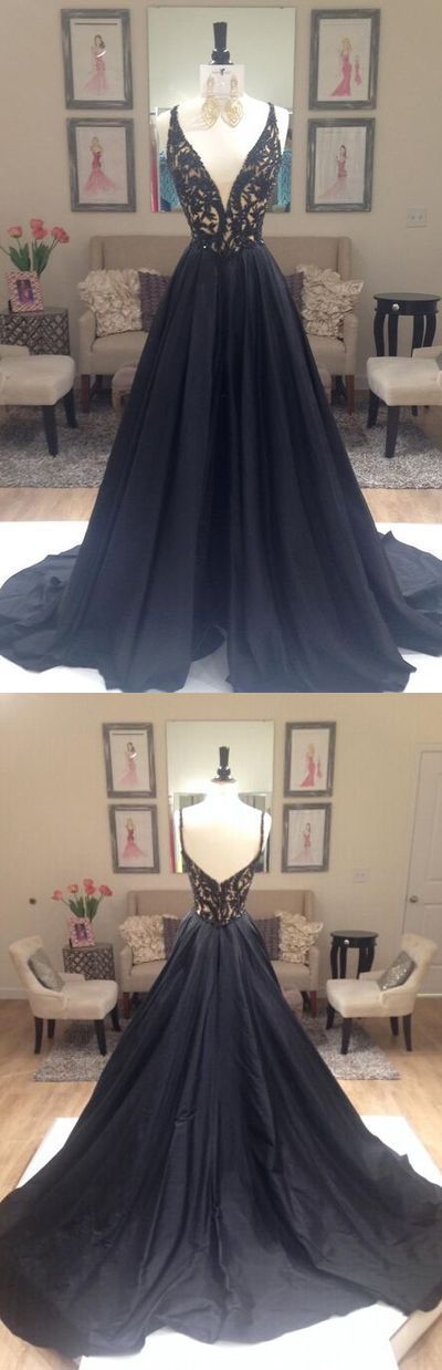 A-Line Long Black Lace V-Neck Prom Dresses Party Evening Gowns
