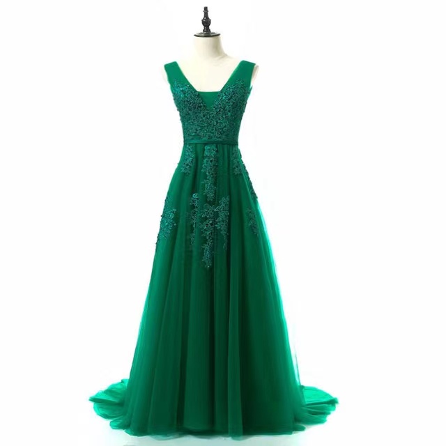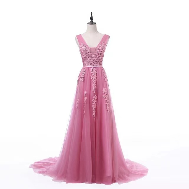 Sweet Lace Dresses, V-neck Long Evening Dresses, Sexy Bridal Party Dresses, Backless Pearl Ball Dresses