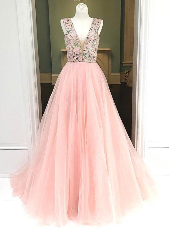 Pink party dress v neck evening dress tulle embroider prom dress