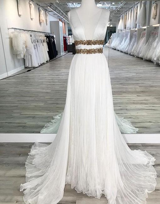 White evening dress v neck party dress chiffon long prom dress,v-neck long evening dress