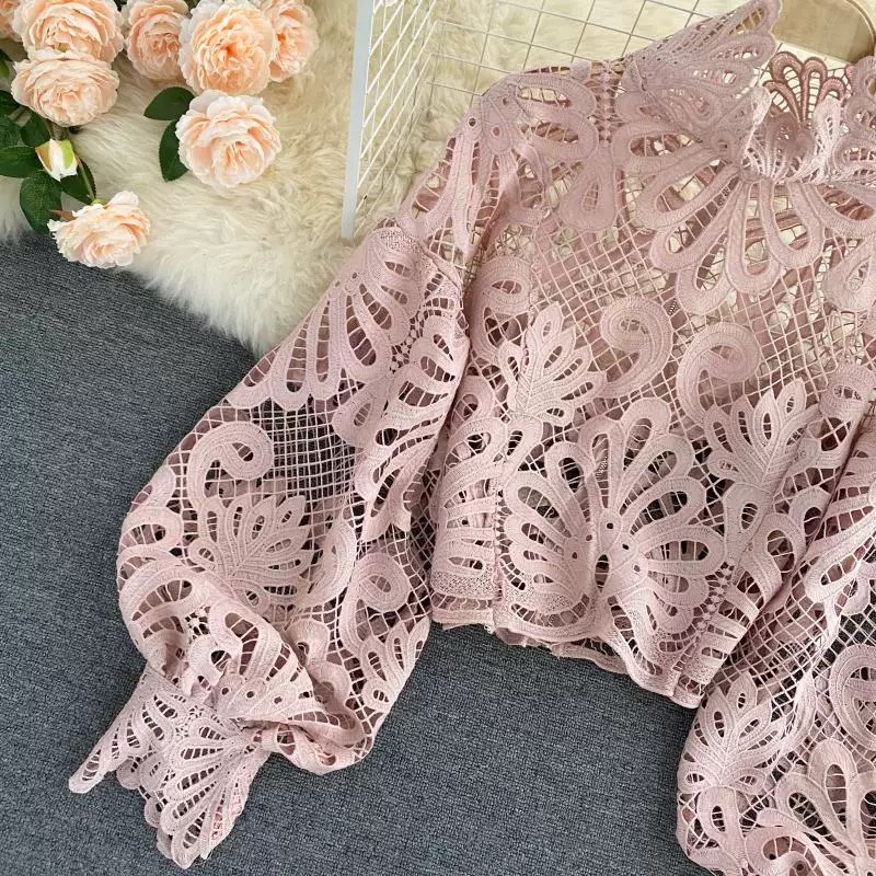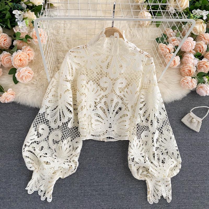 Lace hollow-out top, standing collar bubble sleeves, loose sexy short shirt