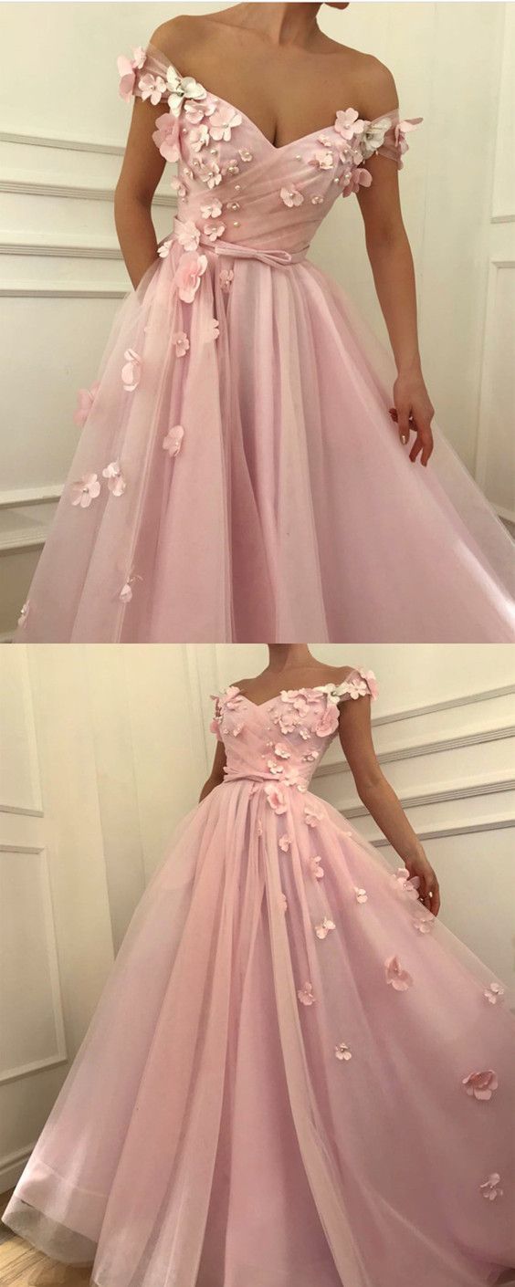 Pretty pink tulle long prom dresses v-neck off the shoulder evening gowns with flowers beaded by prom dresses