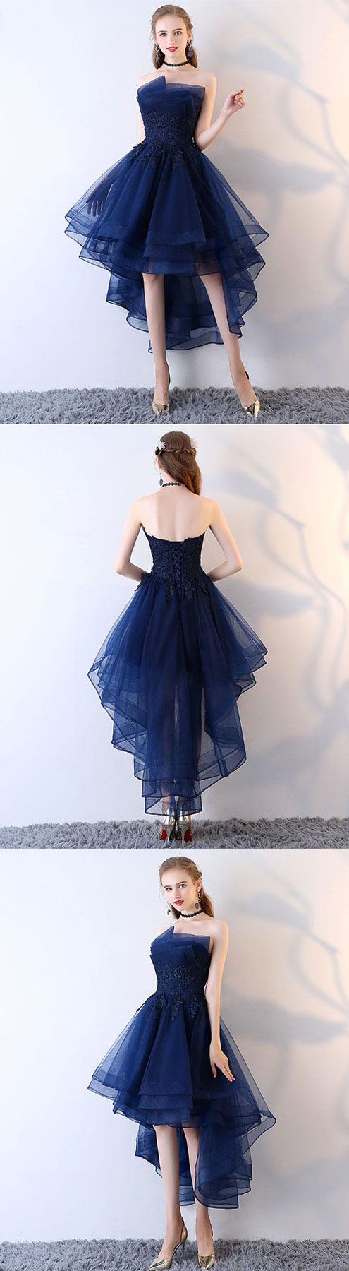 Dark blue tulle short prom dress, high low evening dress, blue tulle short homecoming dress