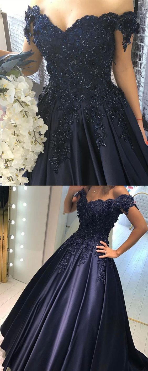 Navy Blue Lace Flower Off The Shoulder Satin Prom Dresses Ball Gowns Quinceanera Dress
