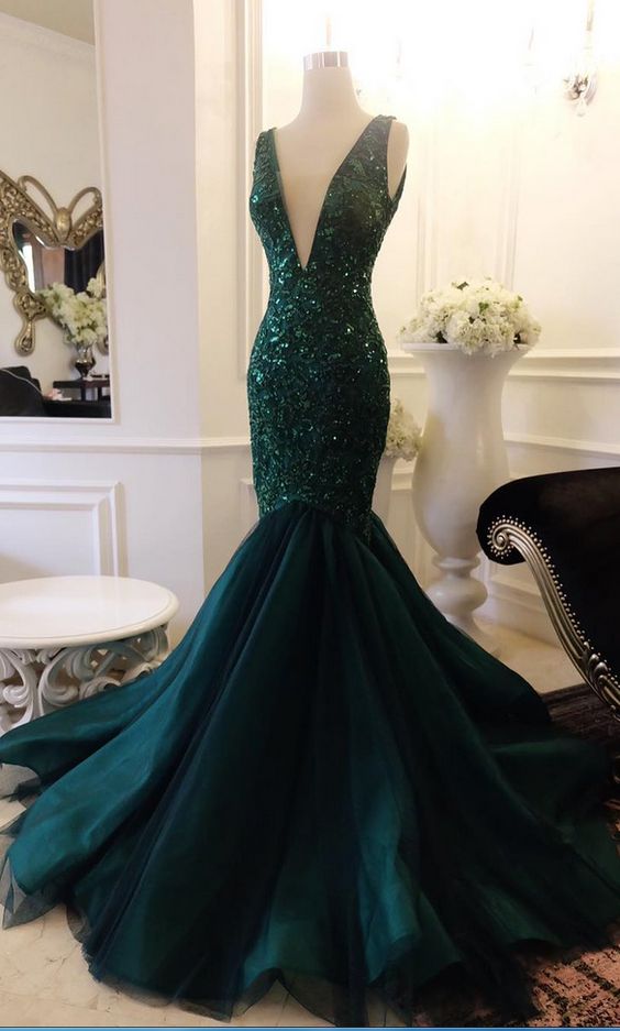 Neck Mermaid Atrovirens Prom Dress with Sequin Appliques Lace V Back Evening Dress