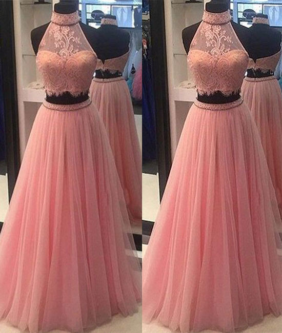 Hot-Selling A-Line Prom Dress,Two-Piece Lace Prom Dresses,Tulle Pink Long Prom Dresses,Evening Dress