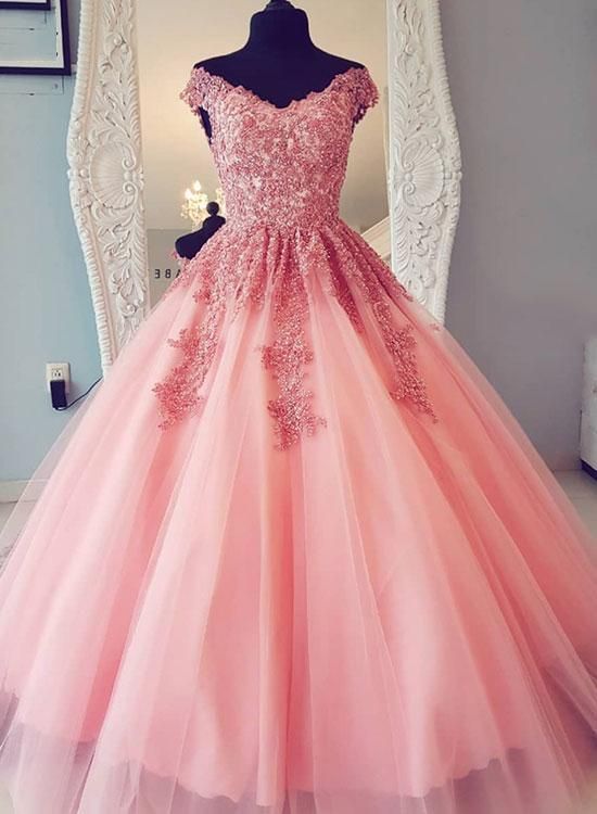 Off shoulder Pink Tulle evening dress Lace Long Prom Dress, Pink Evening Dress Long ball gowns