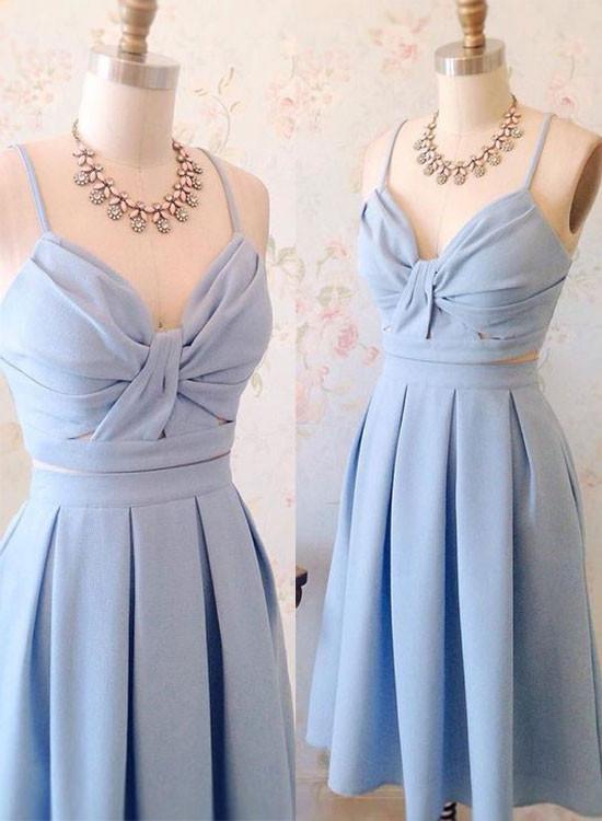 Light blue party dress two piece evening dress spaghetti straps prom dress v neck bow homecoming dress