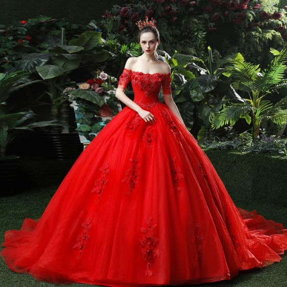 Red wedding dress lace applique wedding dress off shoulder wedding dress