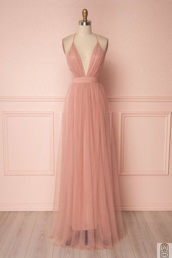 Blush Pink party dress, deep v neck evening dress ,Spaghetti Straps prom dress tulle long formal dress
