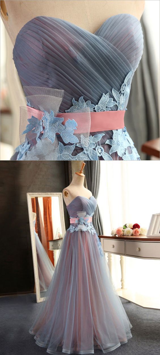 Blue party dress, strapless evening dress, tulle applique long prom dress