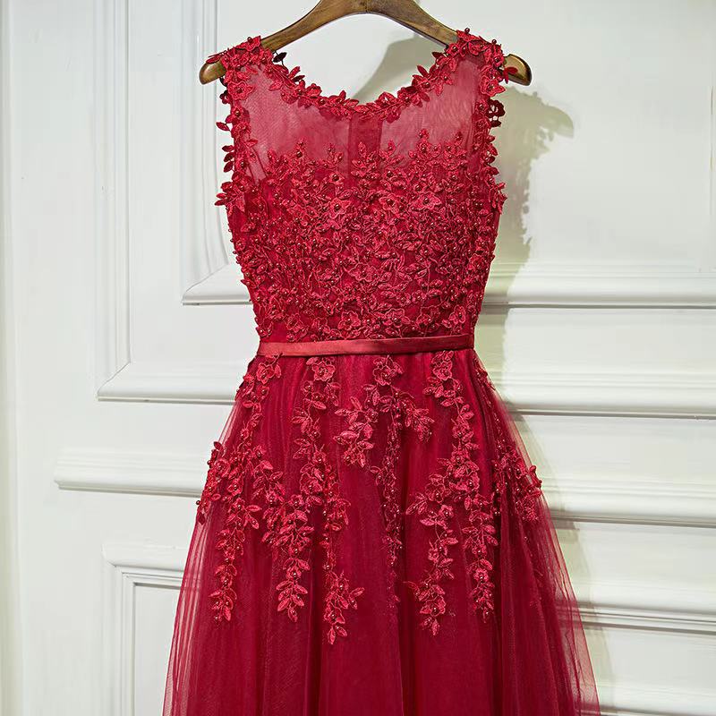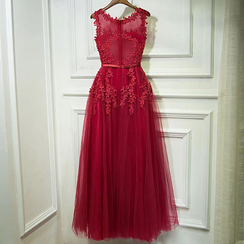 Red evening dress round neck prom dress tulle floor length dress lace applique formal dress