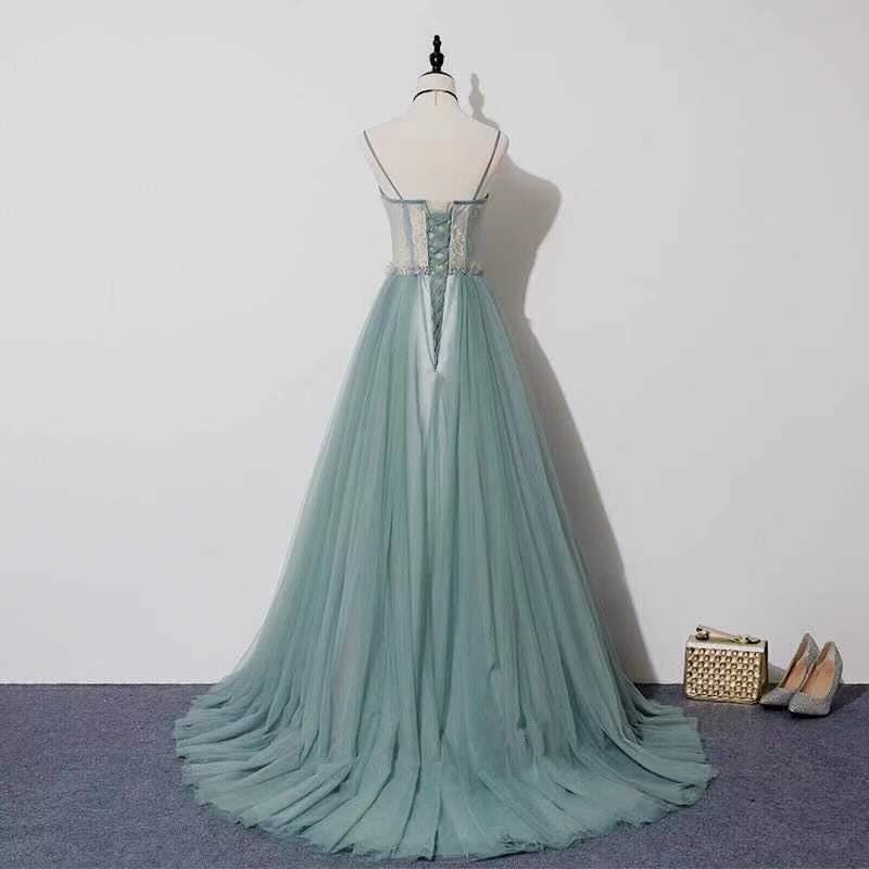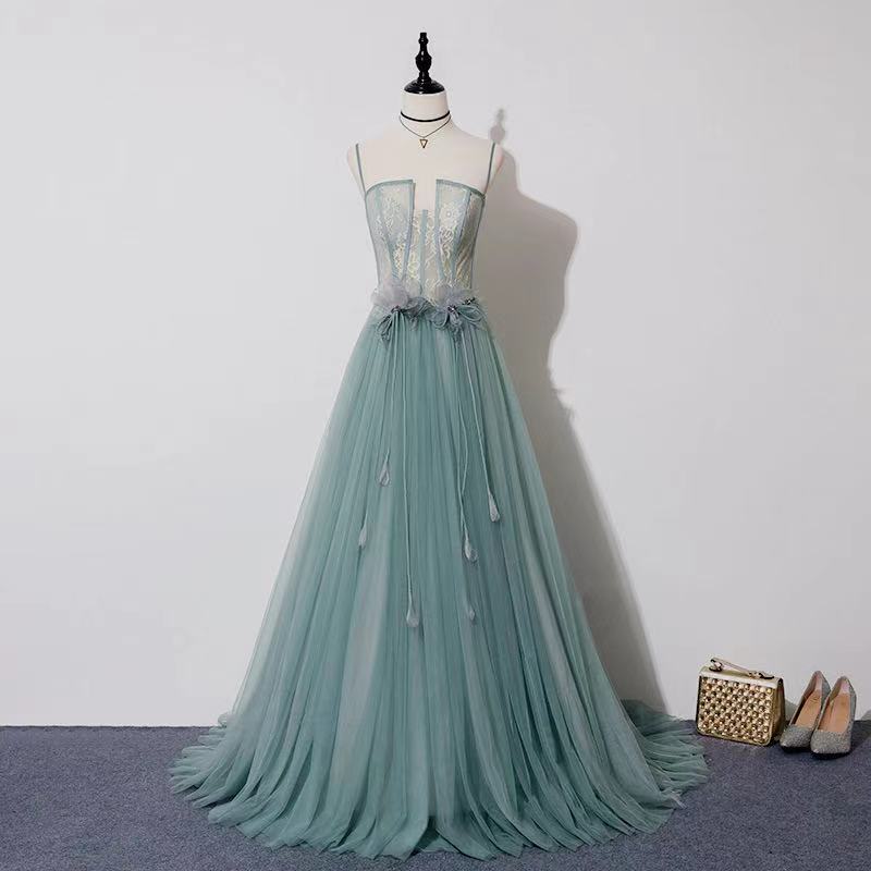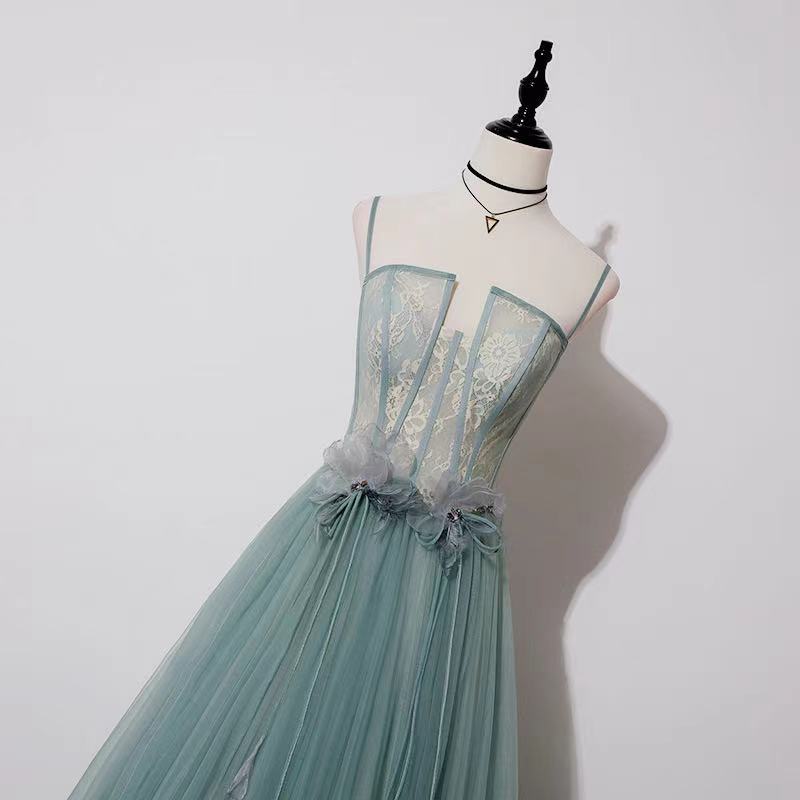 Pale green evening dress spaghetti straps prom dress lace applique prom dress backless formal dress tulle floor length dress