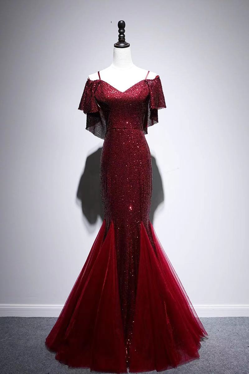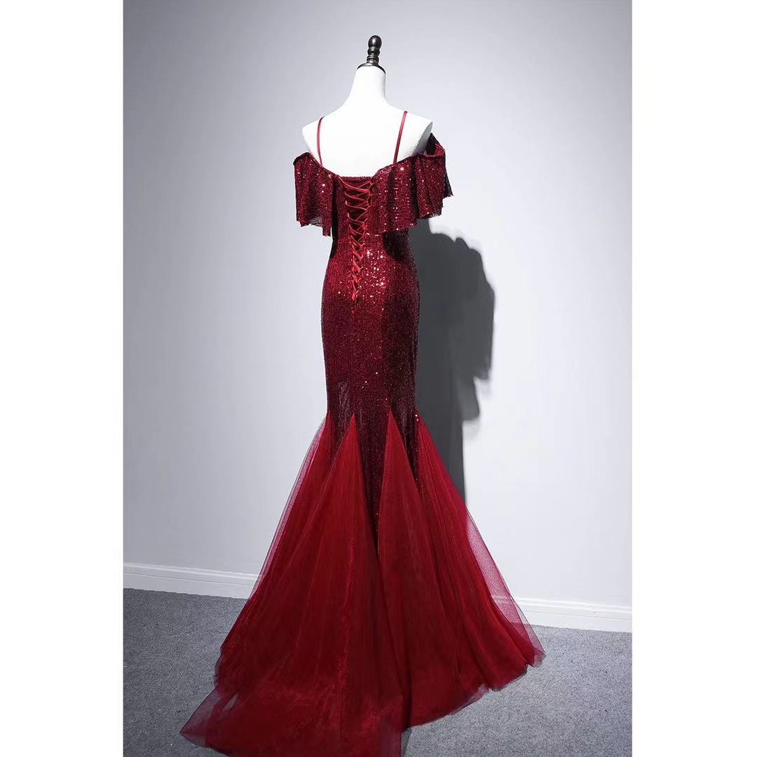 Crimson evening dress spaghetti straps prom dress sparkling formal dress lace floor length dress