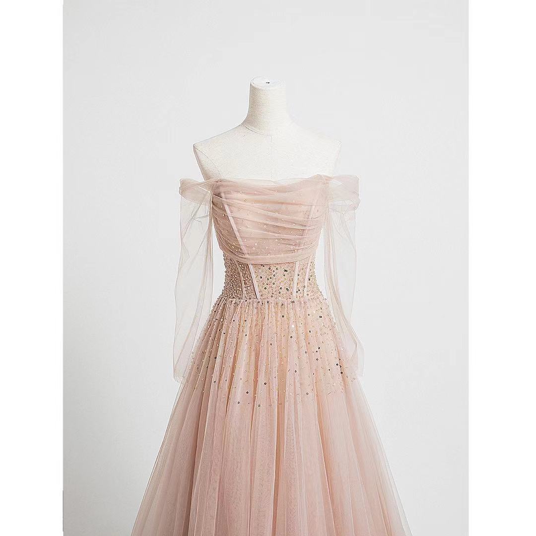 Champagne evening dress Long transparent sleeves prom dress tulle beads formal dress