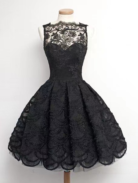 Vintage evening dress black Homecoming Dress Black Sheer Neck with Lace formal dress