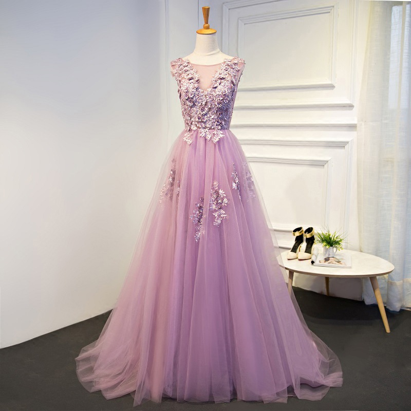Pink party dress round neck evening dress tulle long prom dress lace applique formal dress