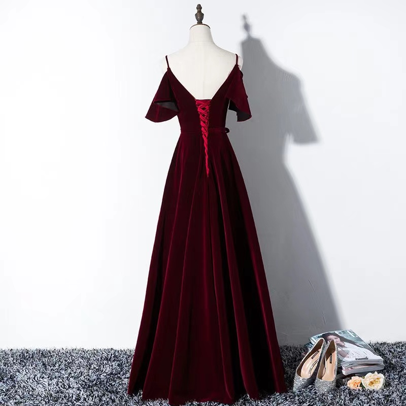 Wine red party dress deep v neck evening dress velvet temperament prom dress