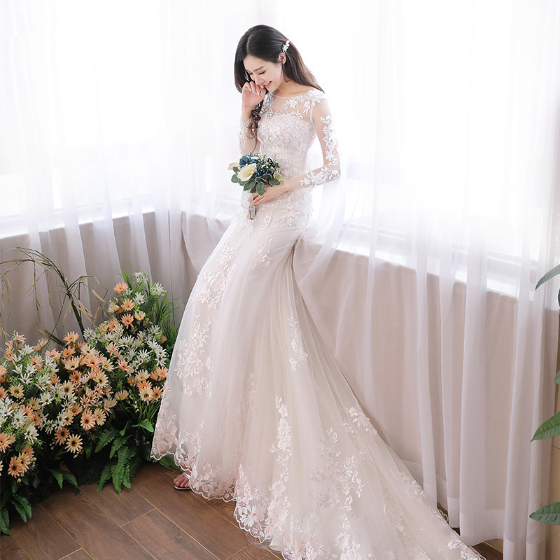 White wedding dress,lace applique wedding dress ,mermaid wedding dress ,long sleeve wedding dress, sexy trailing bridal dress