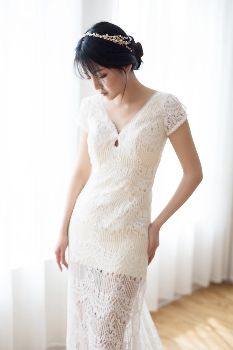 White wedding dress ,lace applique wedding dress ,v neck wedding dress ,mermaid sexy wedding dress