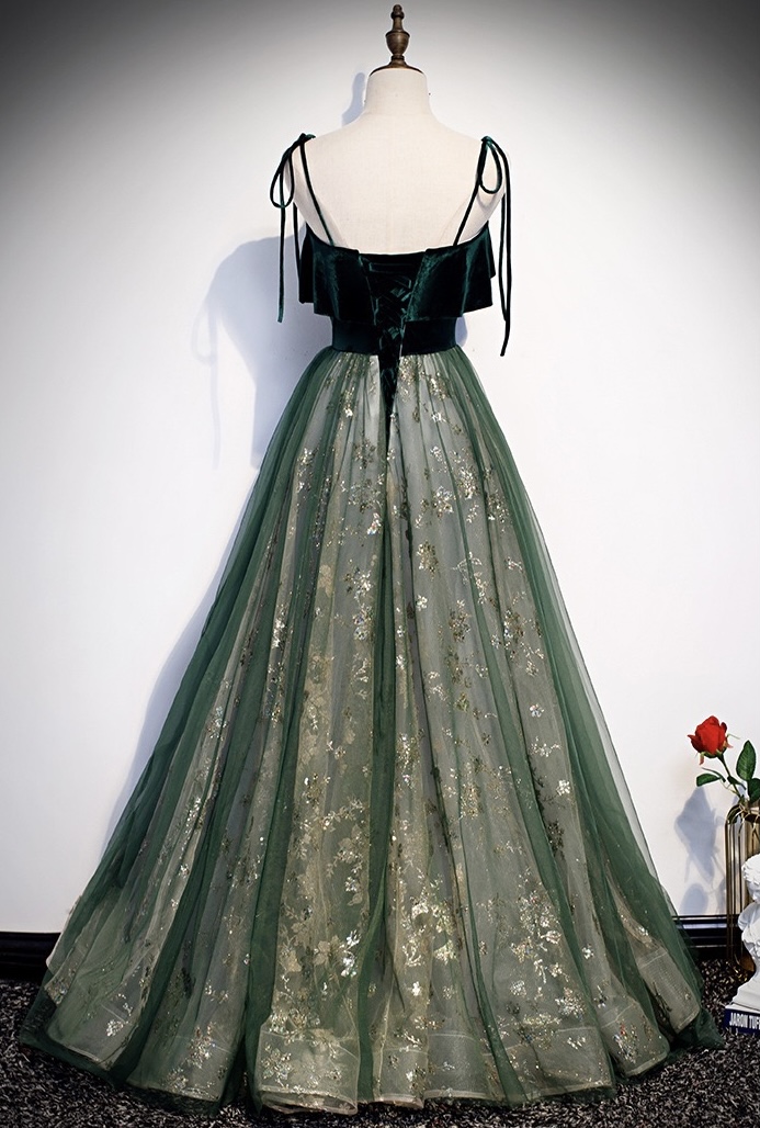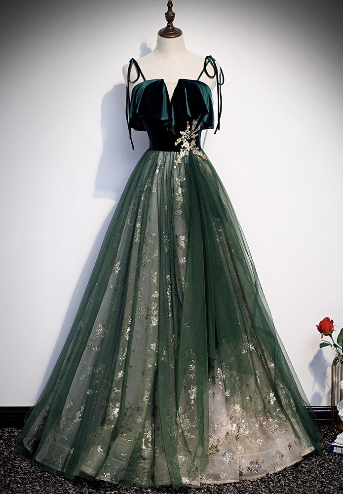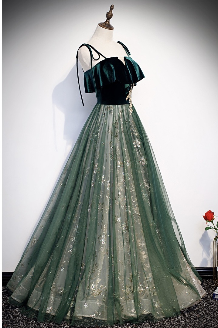 Spaghetti strap evening dress, temperament, green long fairy dress, dream shiny party dress,custom made